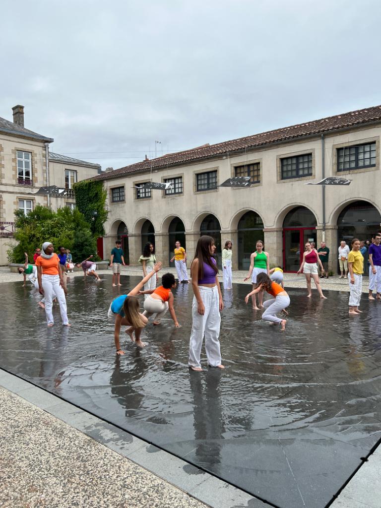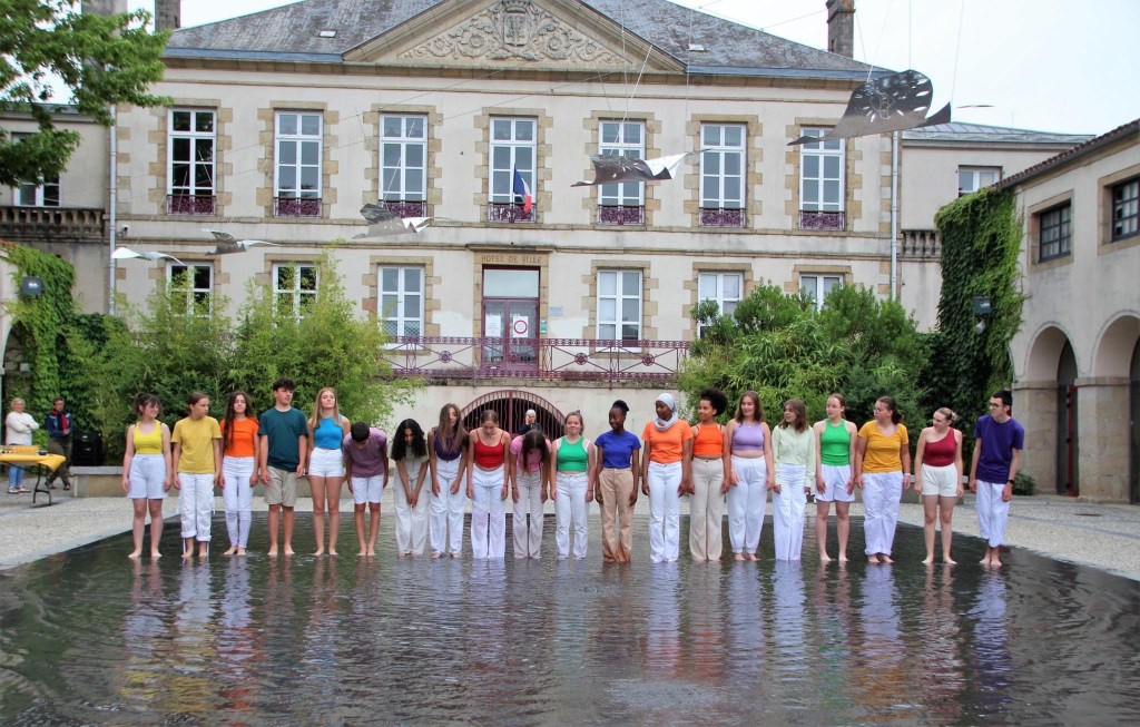 Pendant trois jours de résidence avec 22 élèves volontaires issus de plusieurs classes de quatrième du collège supervielle à Bressuire, nous avons créer une forme chorégraphique de dix minutes pour inaugurer le festival de sarts de la rue de Bressuire, sur le miroir d’eau de Bressuire. Le travail a consisté à faire rentrer en dialogue les élèves avec l’œuvre de Sandrine Pincemaille : « les oiseaux migrateurs », thématique en lien avec le travail de la compagnie need. Les collégiens ont donc dansés les pieds dans l’eau sous une lignée d’oiseaux suspendus.